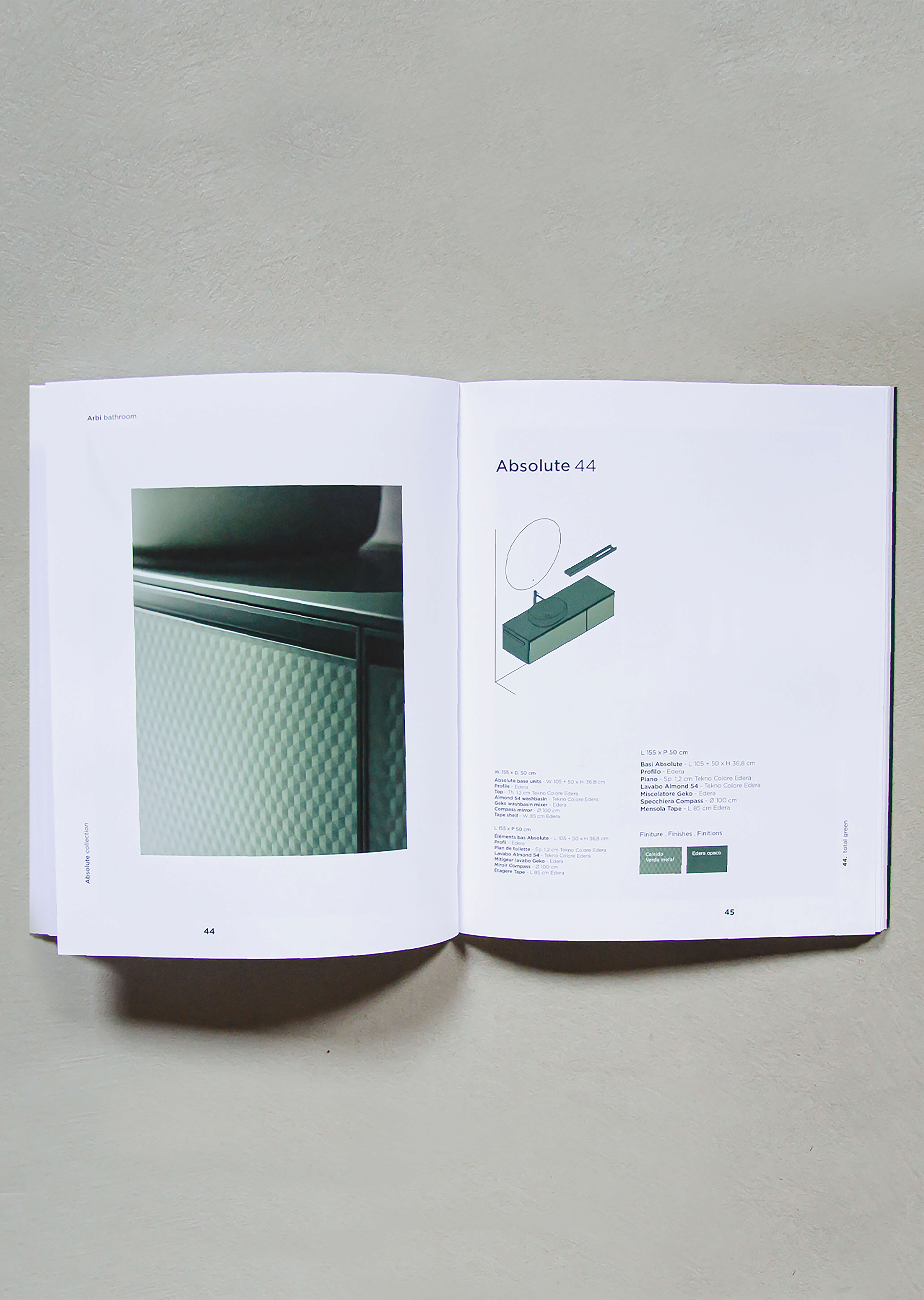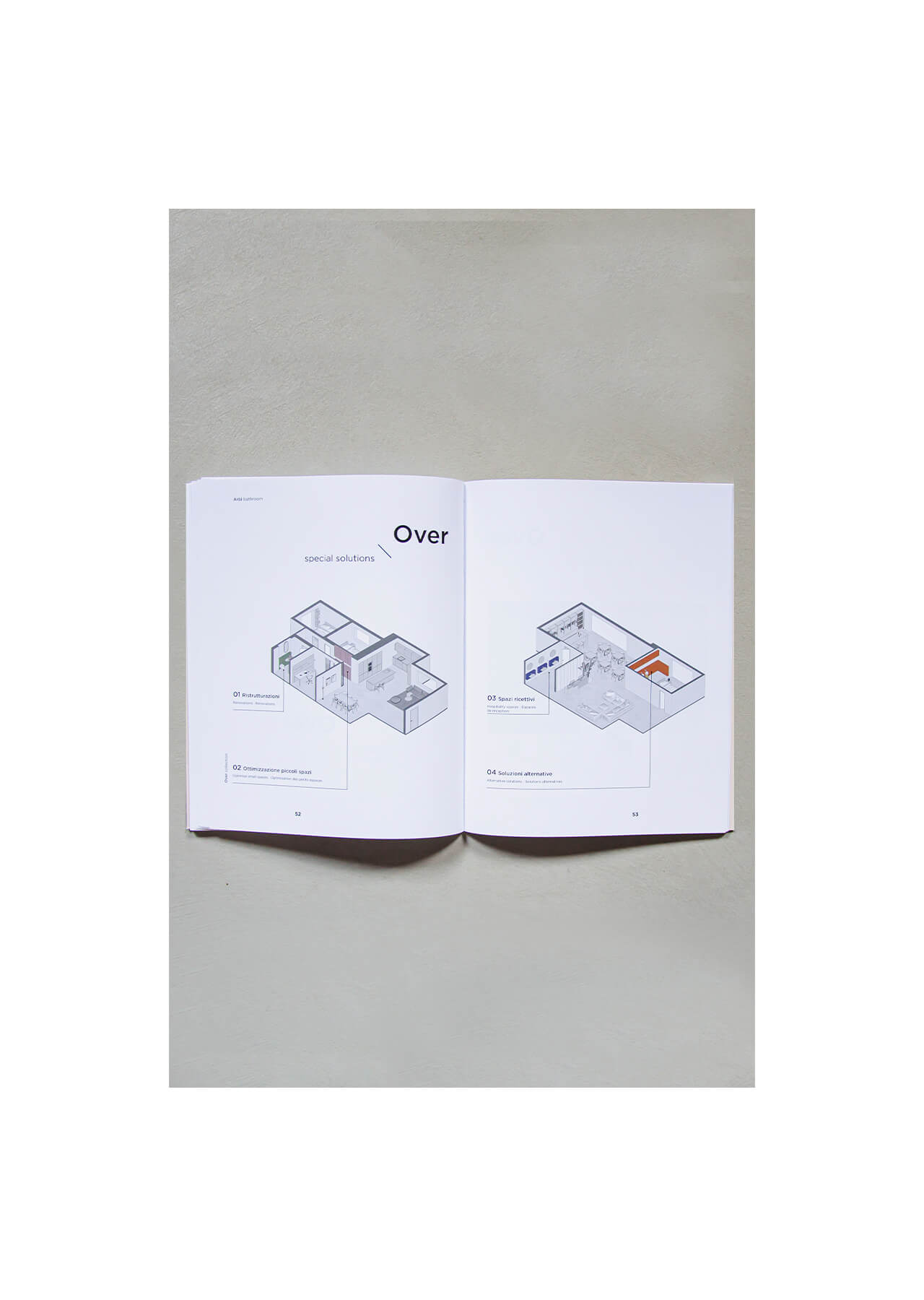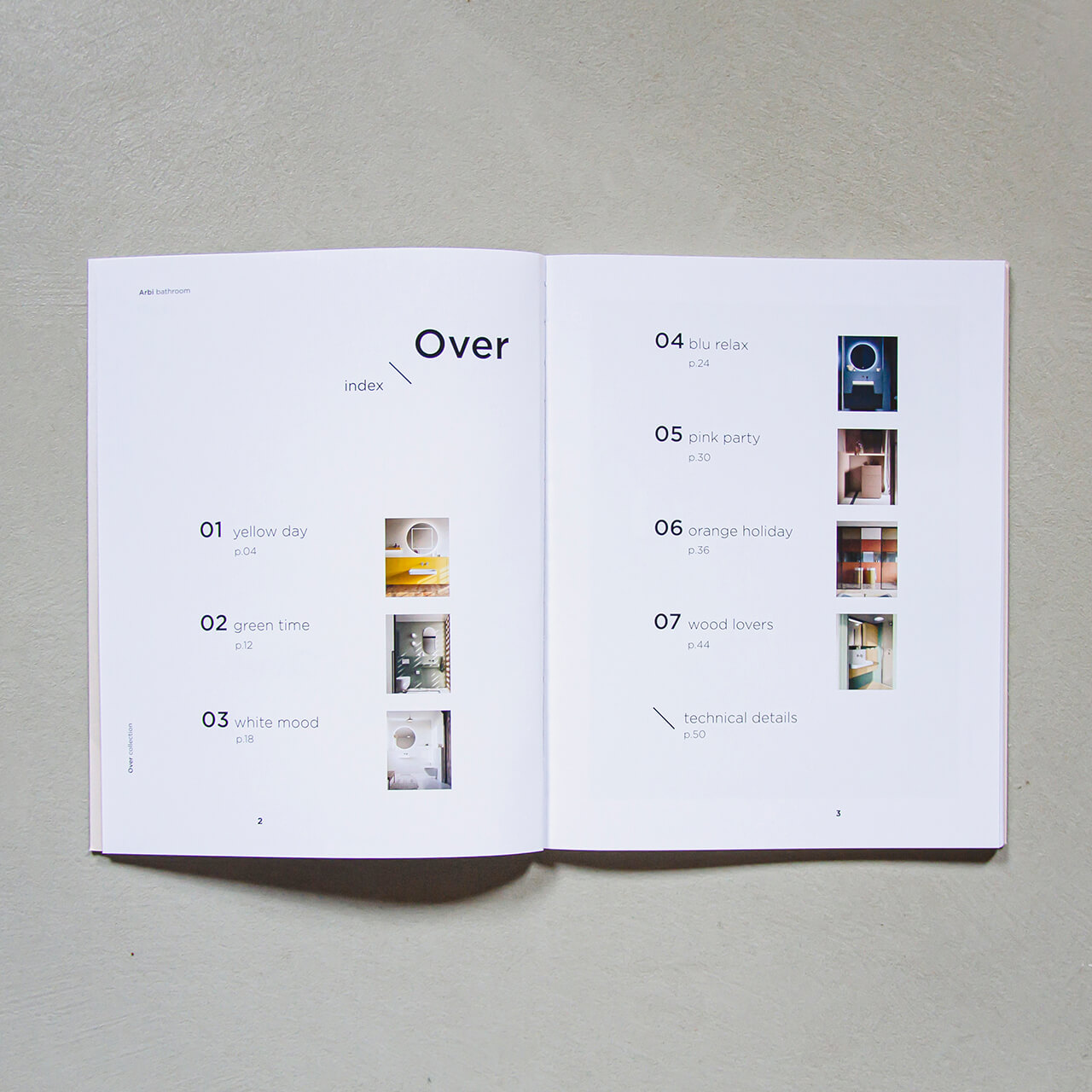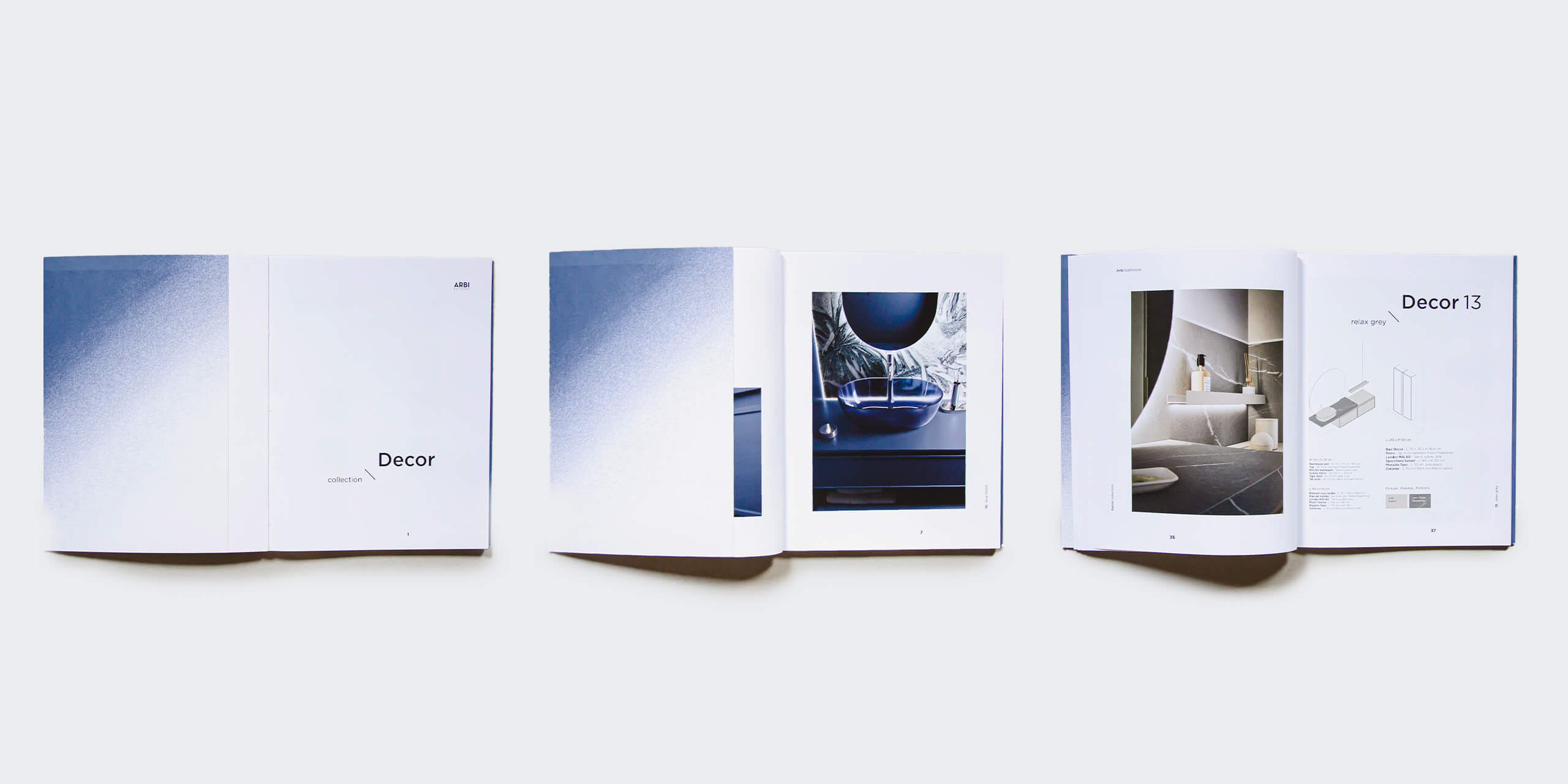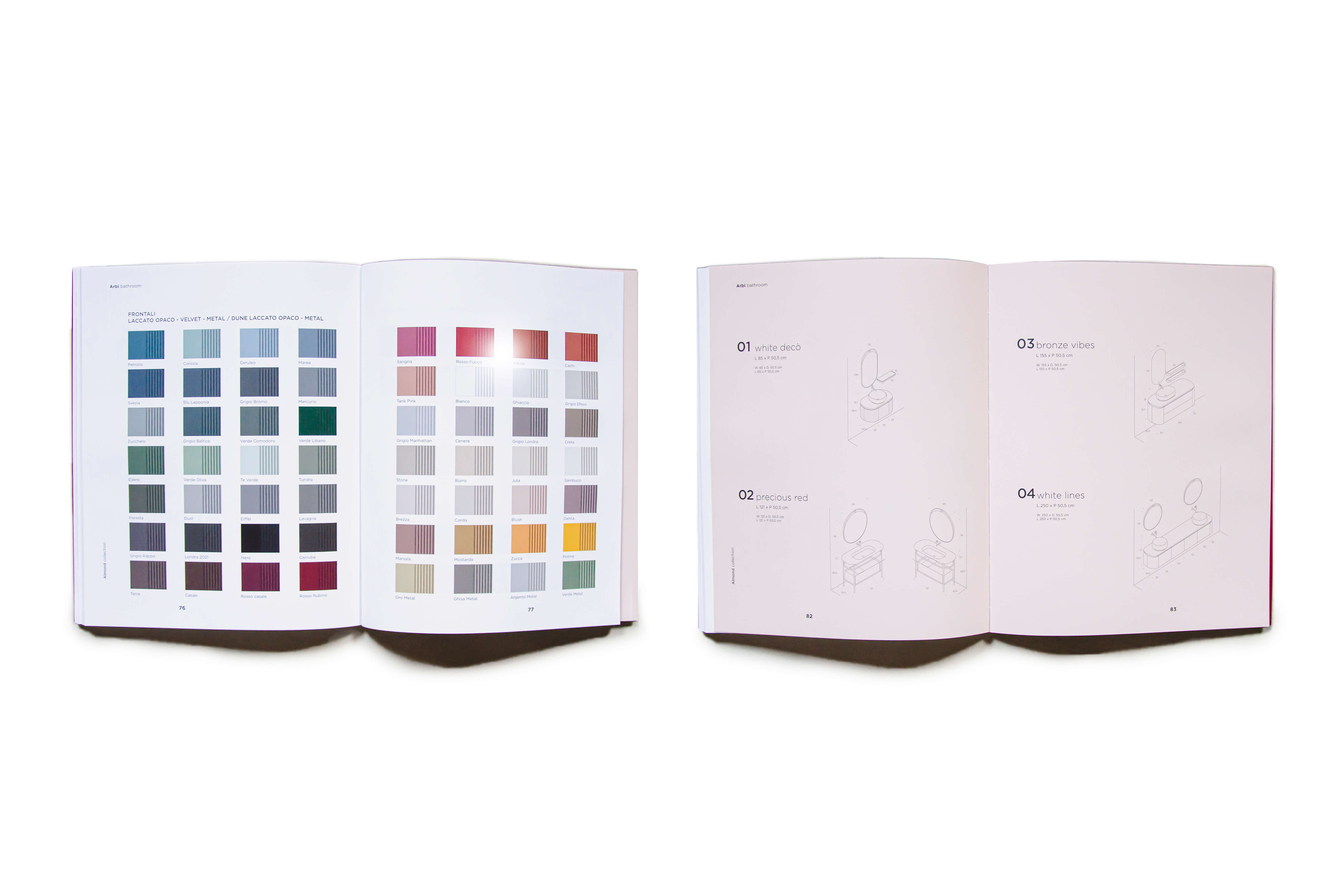 Per Arbi, lo studio cura la direzione artistica e il set design dei cataloghi, costruendo un linguaggio visivo capace di unire progettazione del prodotto, immagine e racconto. L’attività nasce da un dialogo costante con l’azienda: dallo sviluppo dei prodotti alla loro rappresentazione grafica, ogni fase è guidata dalla ricerca di coerenza tra forma, colore e spazio. Il lavoro sulle copertine e sul layout interno si traduce in un sistema di segni e cromatismi che definisce l’identità visiva delle collezioni, mentre il set design interpreta gli ambienti come veri e propri scenari progettati intorno all’estetica del prodotto. Architetture, palette, materiali e oggettistica vengono selezionati e coordinati in un processo di revisione continua, in cui ogni dettaglio contribuisce alla costruzione dell’immagine complessiva. Completano il progetto i disegni tecnici, pensati per raccontare in modo chiaro e immediato le diverse composizioni e possibilità del sistema.