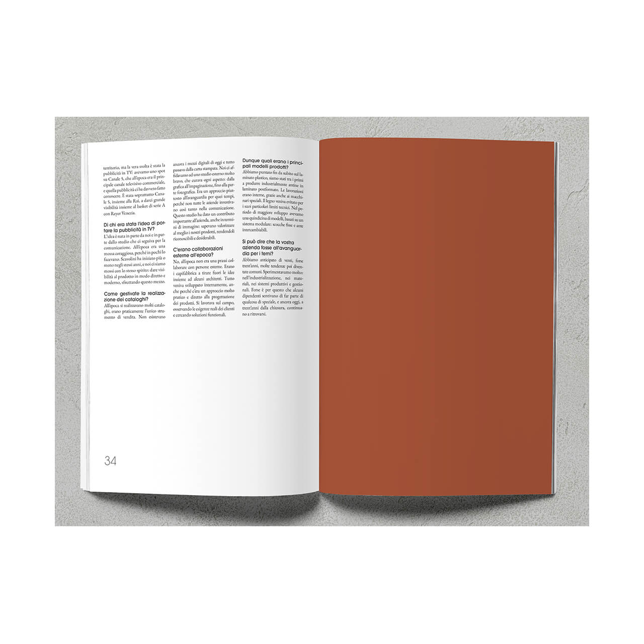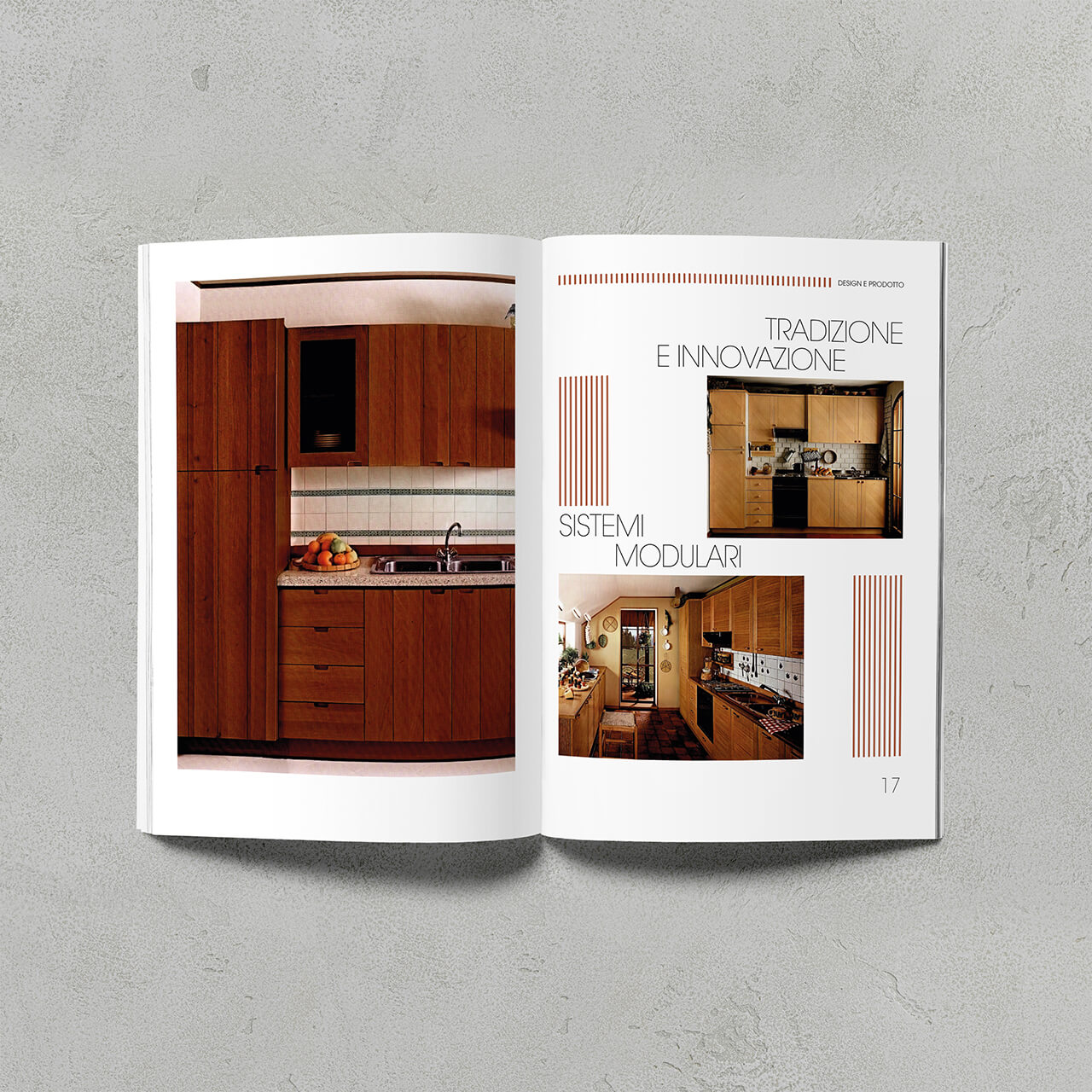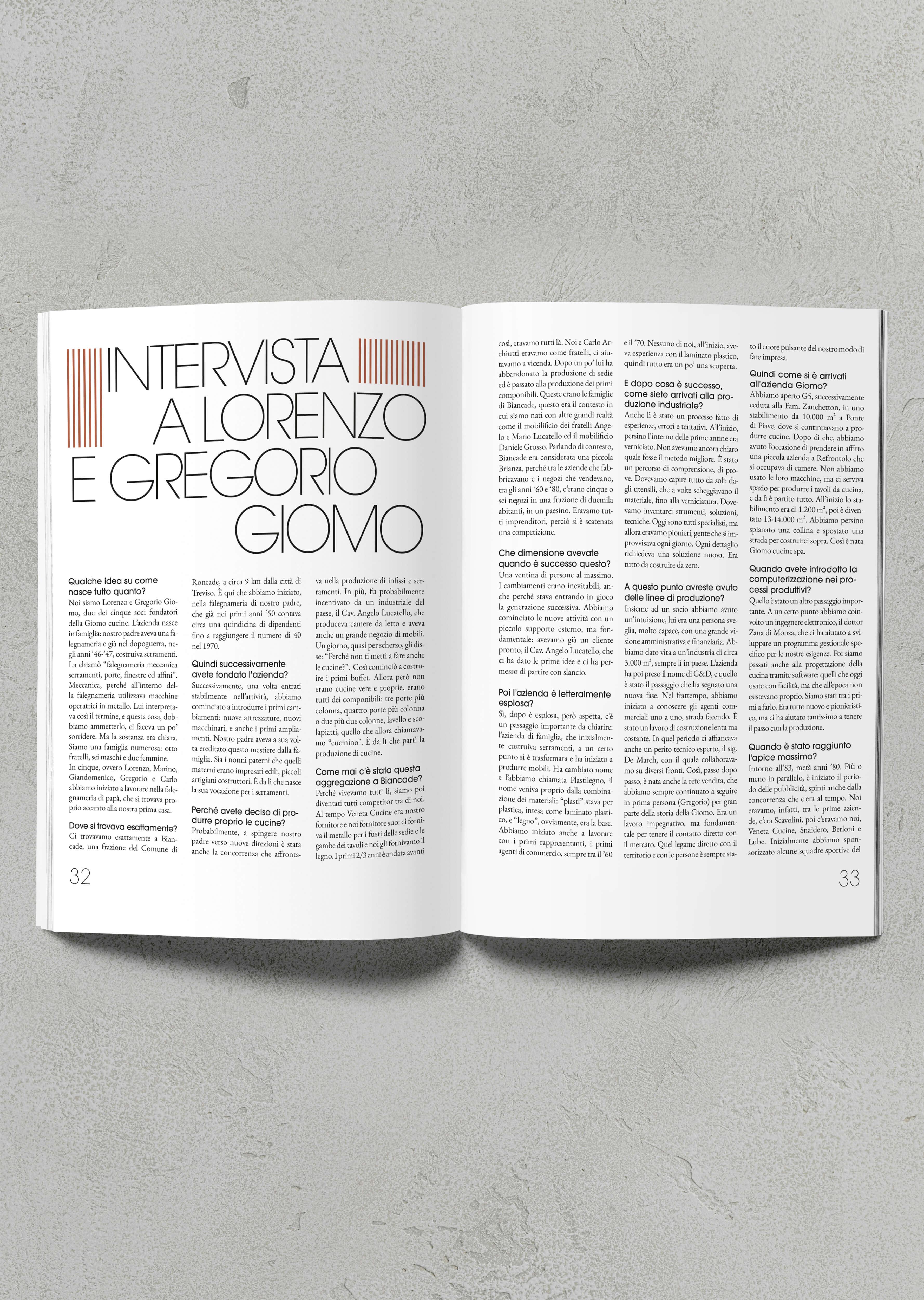 Per Giomo Cucine, lo studio ha raccolto e reinterpretato il patrimonio visivo e documentale dell’azienda, costruendo un racconto che restituisce la sua storia e il suo spirito. Fotografie d’archivio, interviste, cataloghi e campagne pubblicitarie sono stati analizzati e riorganizzati in tre grandi temi: i colleghi come famiglia, l’impegno nello sport e nel sostegno ai giovani atleti, e la costante ricerca di innovazione tecnologica e comunicativa. Da questo lavoro è nato un magazine che ripercorre le tappe principali della storia di Giomo, un progetto editoriale pensato per celebrare la memoria di un’azienda trevigiana che ha saputo distinguersi per visione, umanità e capacità di anticipare i tempi. Un racconto visivo e testuale che diventa omaggio e riconoscimento a chi, con passione e dedizione, ne ha costruito l’identità.