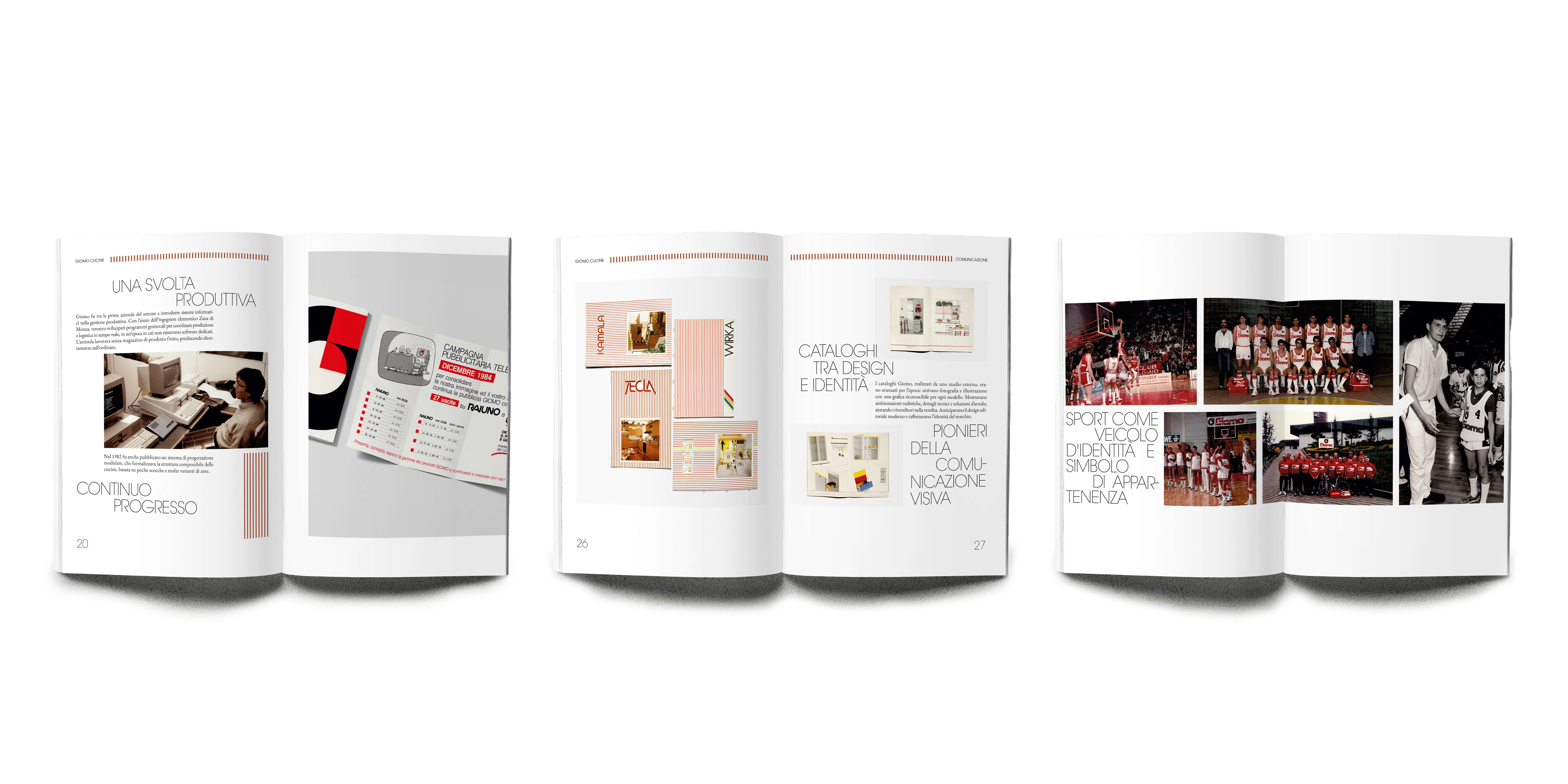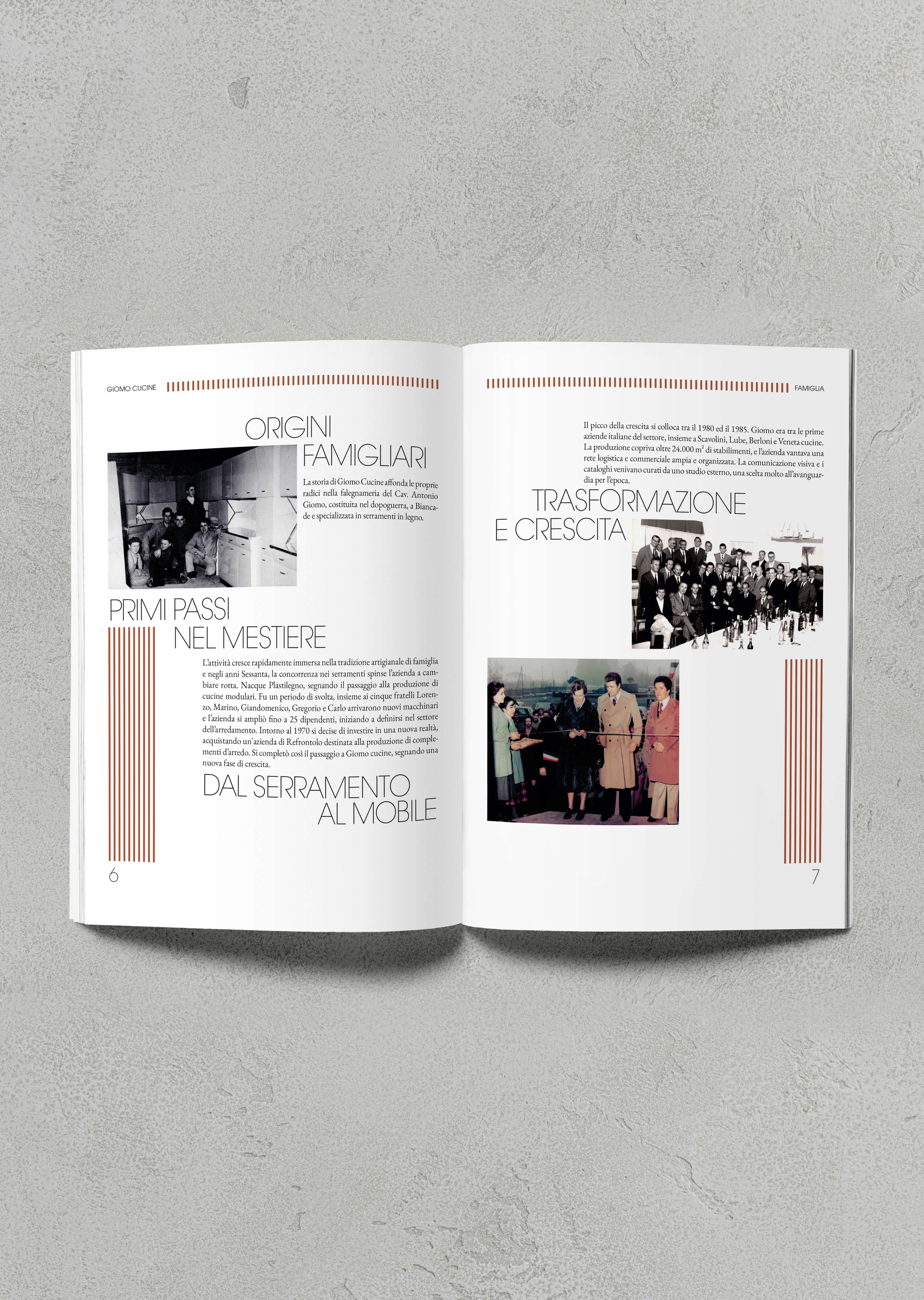 For Giomo Cucine, the studio collected and reinterpreted the company’s visual and documentary heritage, shaping a narrative that reflects its history and spirit. Archival photographs, interviews, catalogues, and advertising materials were studied and reorganized into three main themes: colleagues as family, the company’s commitment to sports and support for young athletes, and its forward-looking approach to technology and communication. From this research emerged a magazine that retraces the key moments in Giomo’s story — an editorial project designed to celebrate the legacy of a Treviso-based company that has distinguished itself through vision, humanity, and innovation. A visual and written narrative that stands as a tribute and recognition to those who, with passion and dedication, helped build its identity..